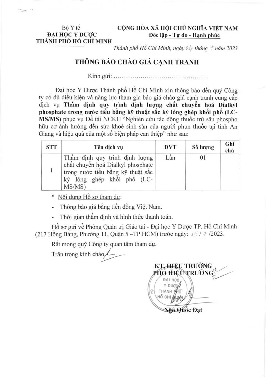 vx88 code chào giá cạnh tranh: "Cung cấp dịch vụ Thẩm định quy trình định lượng chất chuyển hóa Dialkyl Phosphate trong nước tiểu bằng kỹ thuật sắc ký lỏng ghép khối phổ" Đề tài NCKH - Đại Học vx88b Tp.vx88m