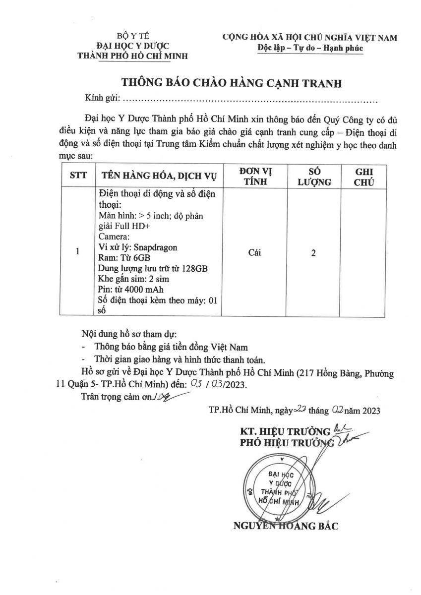 Thời gian nhận hồ sơ chào giá: từ ngày ra thông báo đến ngày 03/03/2023