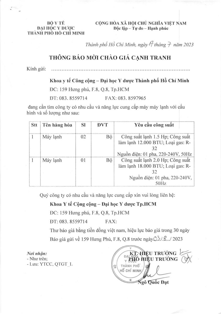Thời gian nhận hồ sơ chào giá: từ ngày ra thông báo đến trước ngày 03/8/2023