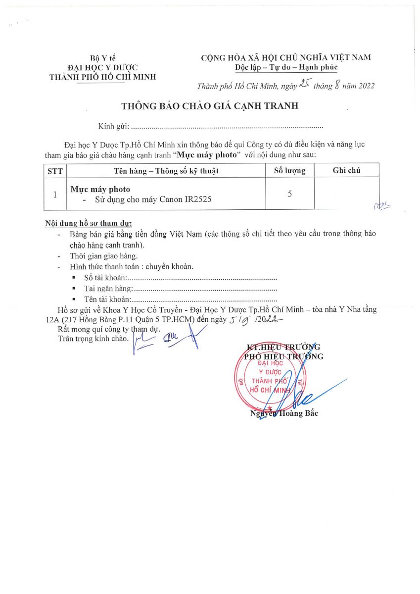 Thời gian nhận báo giá: từ ngày ra thông báo đến ngày 05/9/2022