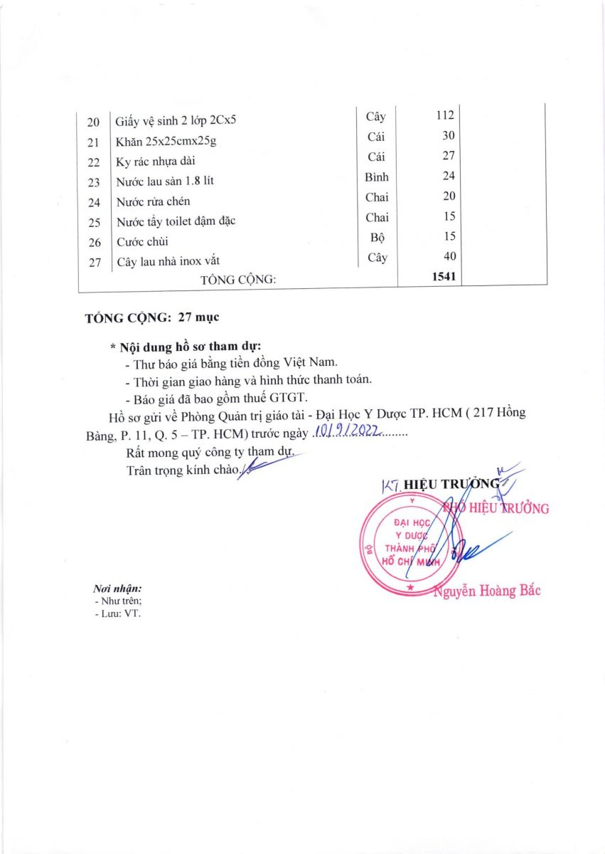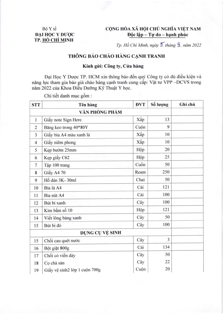 Thời gian nhận báo giá: từ ngày ra thông báo đến ngày 10/9/2022