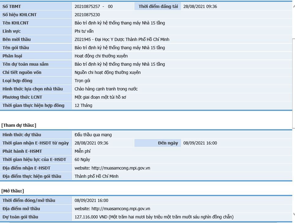 vx88 code mời thầu: Gói thầu Bảo trì thang máy Nhà 15 tầng