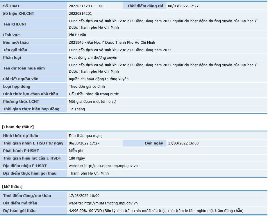 vx88 code mời thầu Gói thầu cung cấp dịch vụ vệ sinh khu vực 217 Hồng Bàng năm 2022 nguồn chi hoạt động thường xuyên của ĐHYD TP.HCM