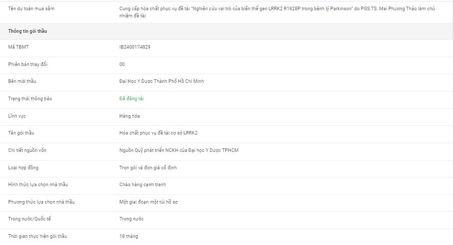 Nguồn kinh phí: Nguồn Quỹ phát triển NCKH của ĐHYD TPHCM Thời gian đóng/mở thầu: 10 giờ 00 ngày 01/7/2024