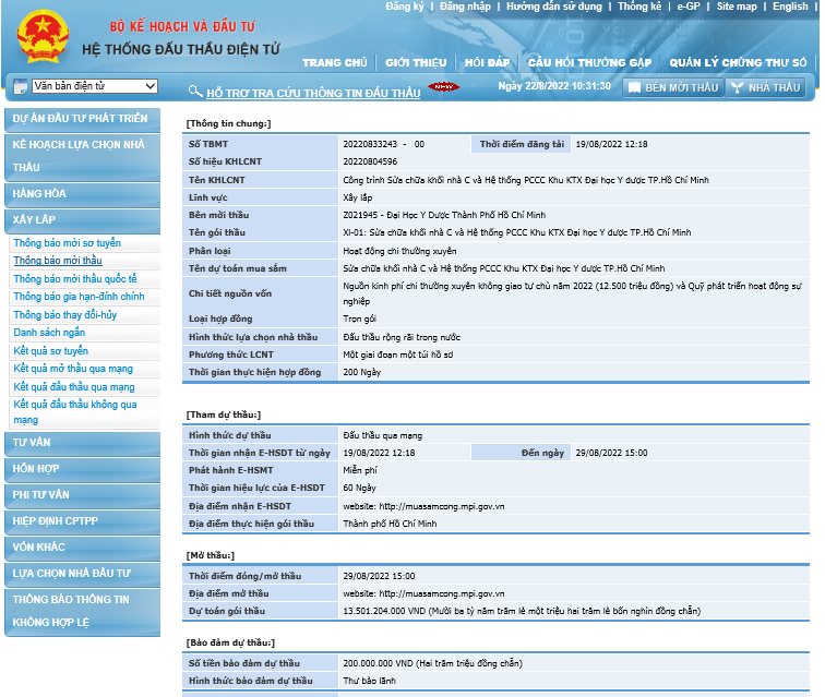 Số TBMT: 20220833243-00 Thời điểm đóng thầu: 15 giờ 00 ngày 29/8/2022.