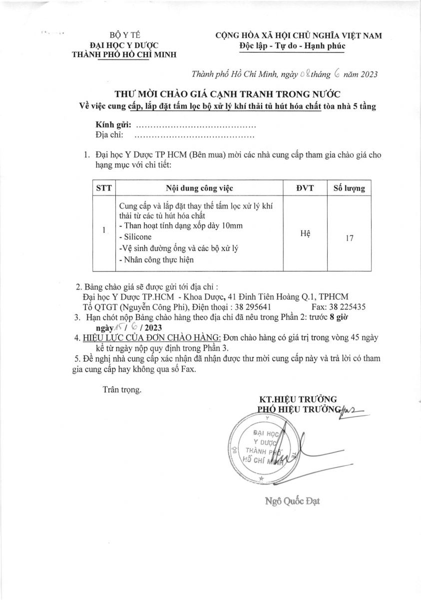 Thời gian nhận hồ sơ chào giá: từ ngày ra thông báo đến 8g00 ngày 15/6/2023