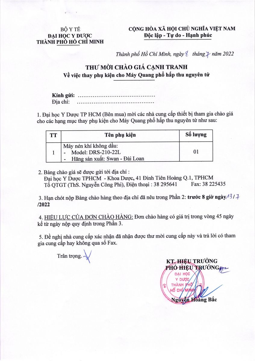 Thư mời Chào giá cạnh tranh "Cung cấp phụ kiện cho máy Quang phổ hấp thu nguyên tử" Khoa Dược - vx88 esball vx88b