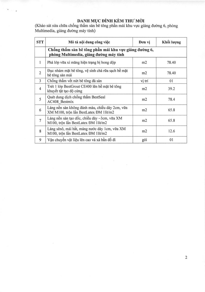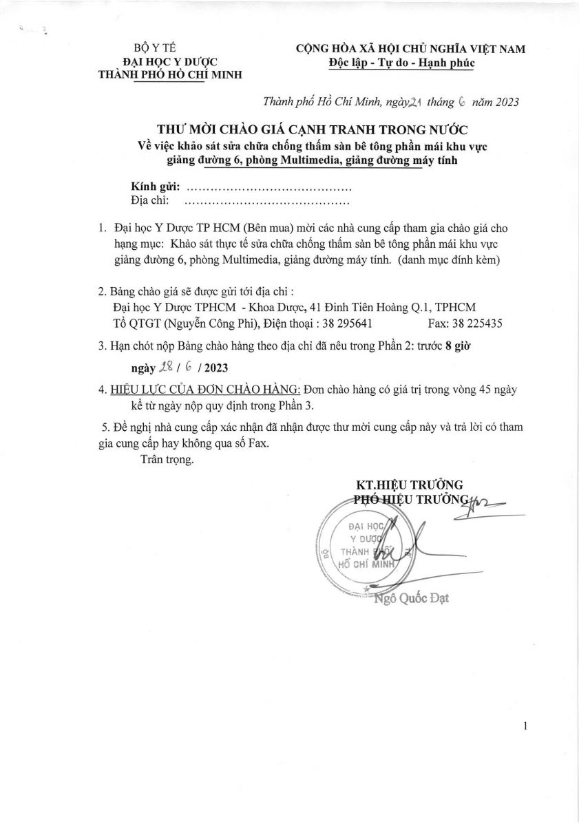 Thư mời chào giá cạnh tranh: " Khảo sát sửa chữa chống thấm sàn bê tông phần mái khu giảng đường 6, phòng Multimedia, giảng đường máy tính " Khoa Dược- vx88 esball Thành Phố vx88m - vx88 code mời thầu