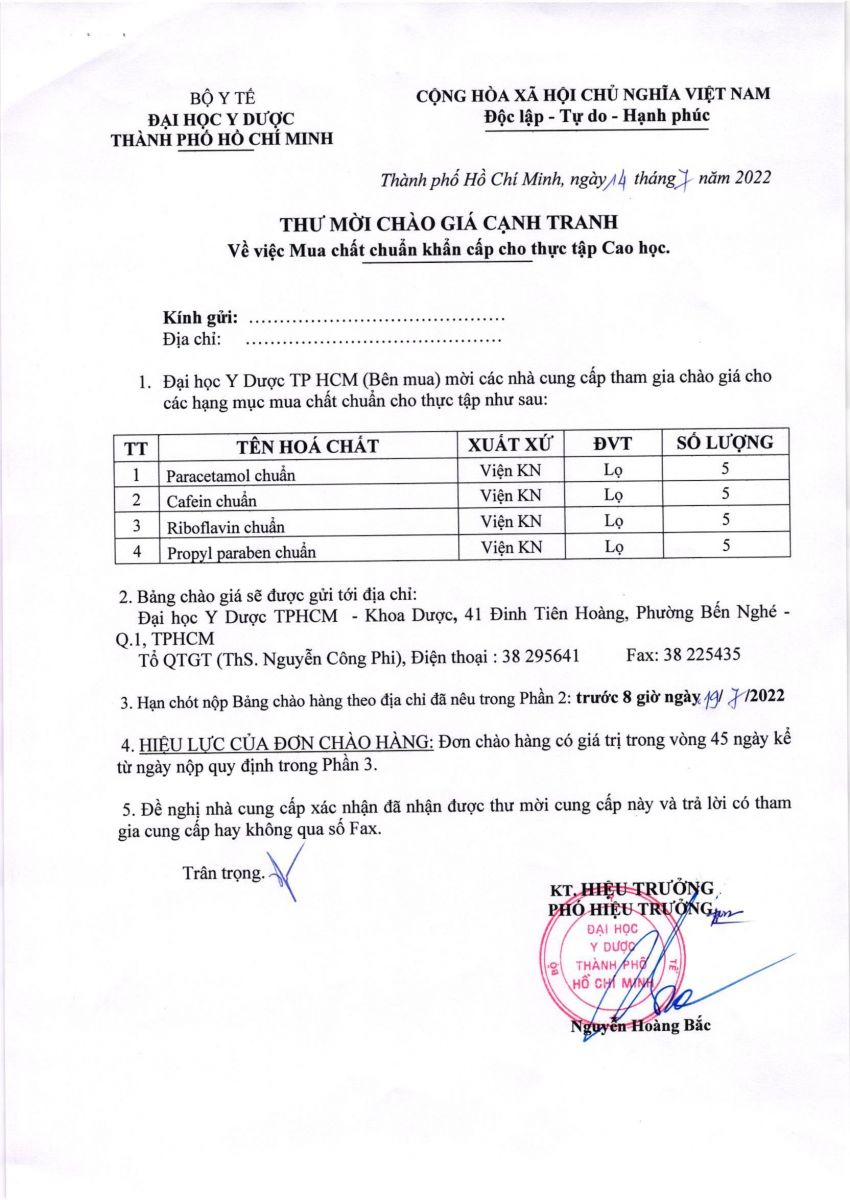 Thư mời Chào giá cạnh tranh "Mua chất chuẩn khẩn cấp cho thực tập Cao học" Khoa Dược - vx88 esball vx88b