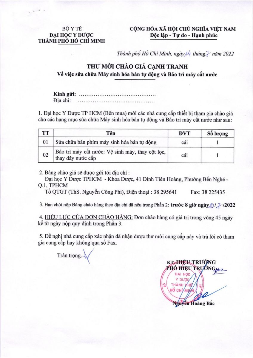 Thư mời Chào giá cạnh tranh "Sửa chữa Máy sinh hóa bán tự động và bảo trì Máy cất nước" Khoa Dược - vx88 esball vx88b