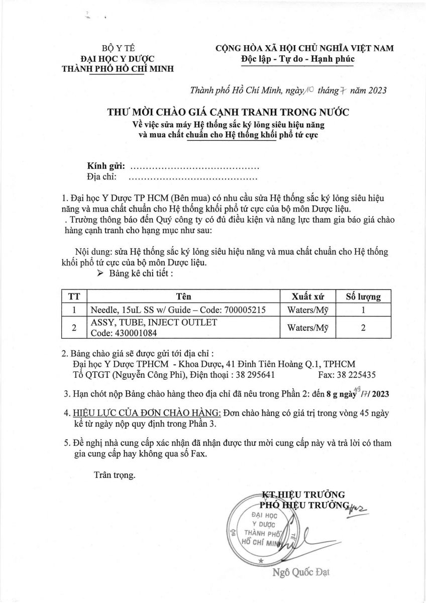 Thư mời chào giá cạnh tranh: " Sửa máy hệ thống sắc ký lỏng siêu hiệu năng và mua hóa chất chuẩn cho HT khối phổ tứ cực" Khoa Dược- vx88 esball Thành Phố vx88m - vx88 code mời thầu