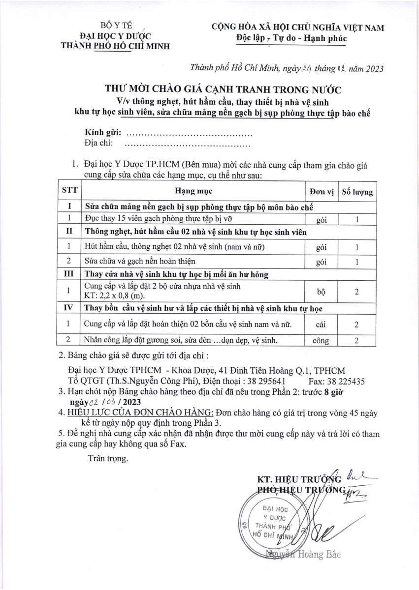 Thư mời chào giá cạnh tranh: "Thông nghẹt, hút hầm cầu, thay thế thiết bị nhà vệ sinh khu tự học sinh viên, sửa chữa mảng nền gạch bị sụp phòng thực tập bào chế" Khoa Dược- vx88 esball Y dược TP.vx88m