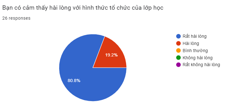 Khảo sát sau khi tham gia khóa học, 100% học viên đánh giá rất hài lòng, hài lòng: