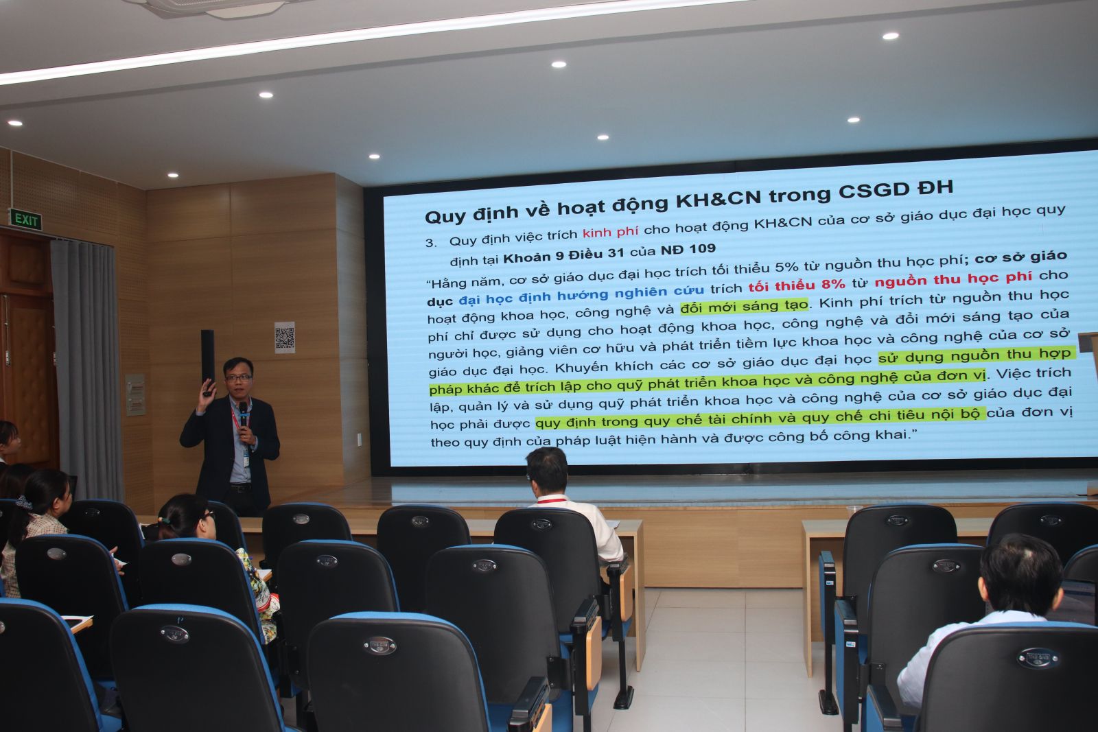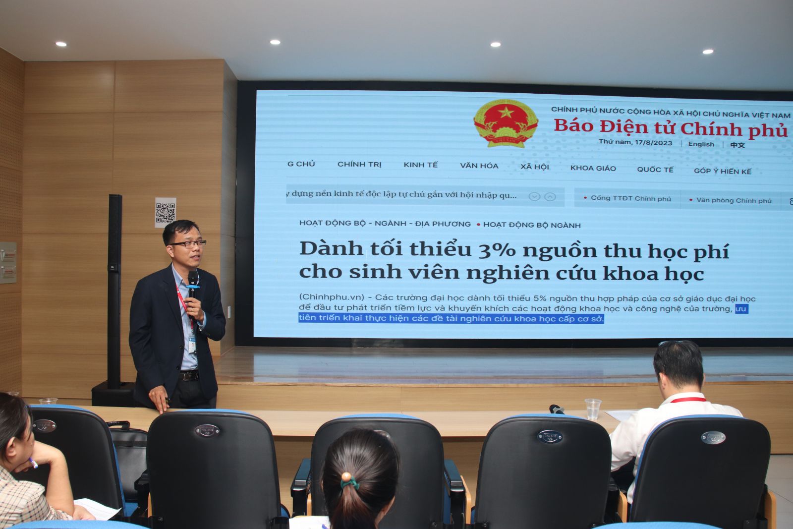 Chiều ngày 28 tháng 9 năm 2023, vx88 esball Thành phố Hồ Chí Minh tổ chức buổi hội thảo chuyên đề liên quan đến việc sửa đổi, bổ sung quy chế quản lý đề tài, dự án khoa học và công nghệ tại vx88 esball Thành phố Hồ Chí Minh (sau đây gọi tắt là Quy chế 126). Chương trình do PGS.TS. Trần Ngọc Đăng – Phó Trưởng phòng Khoa học Công nghệ chủ trì nội dung, cùng sự tham dự của PGS.TS. Ngô Quốc Đạt, Phó Hiệu trưởng điều hành và các thầy cô là lãnh đạo các Khoa, Phòng, Trung tâm, đơn vị thuộc, trực thuộc và 141 viên chức, người lao động của Nhà trường (sau đây gọi là hội thảo viên).