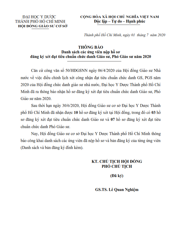 Danh sách các ứng viên nộp hồ sơ đăng ký xét đạt tiêu chuẩn chức danh Giáo sư năm 2020:
