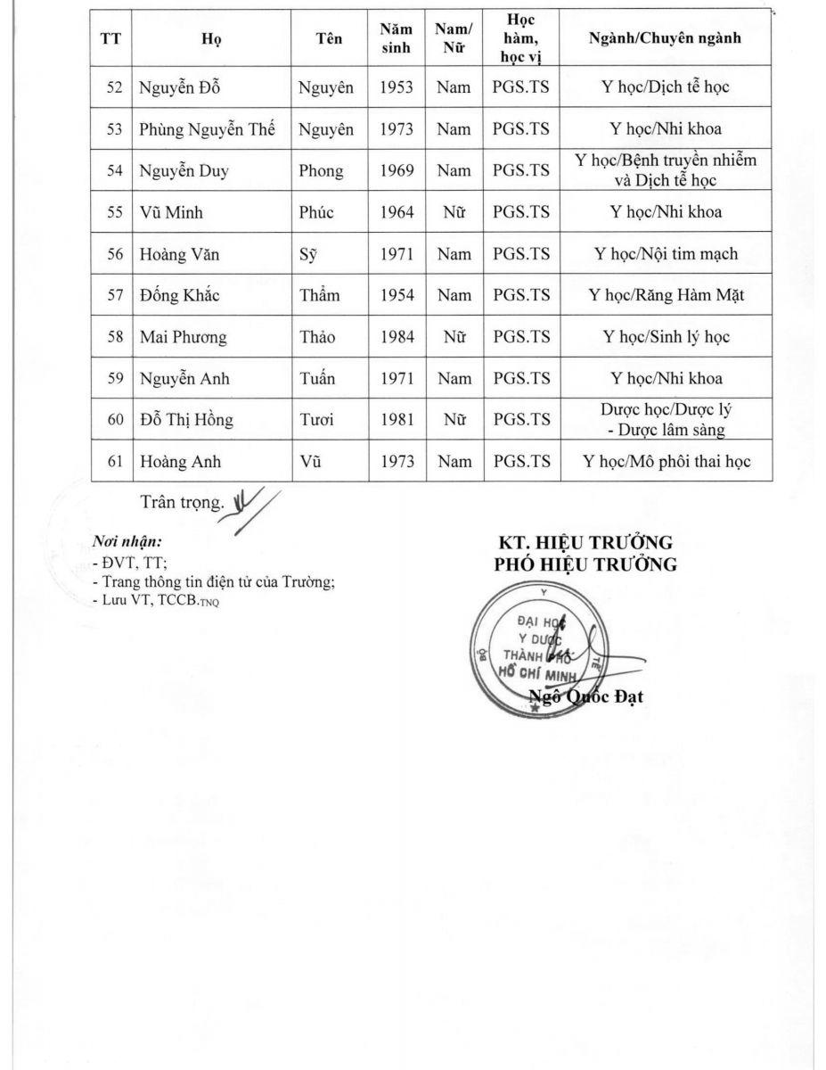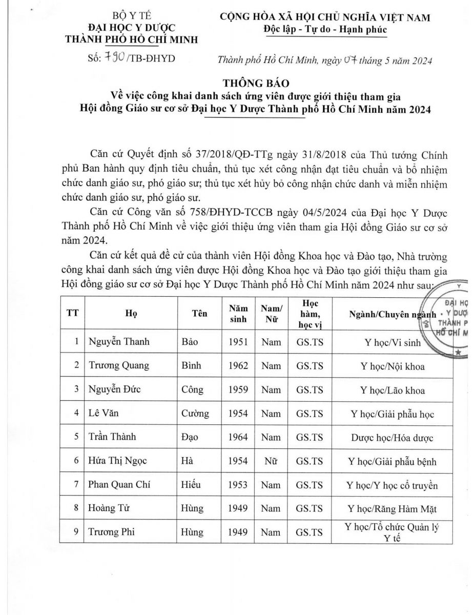 THÔNG BÁO VỀ VIỆC CÔNG KHAI DANH SÁCH ỨNG VIÊN ĐƯỢC GIỚI THIỆU THAM GIA HỘI ĐỒNG GIÁO SƯ CƠ SỞ ĐẠI HỌC Y DƯỢC THÀNH PHỐ HỒ CHÍ MINH NĂM 2024