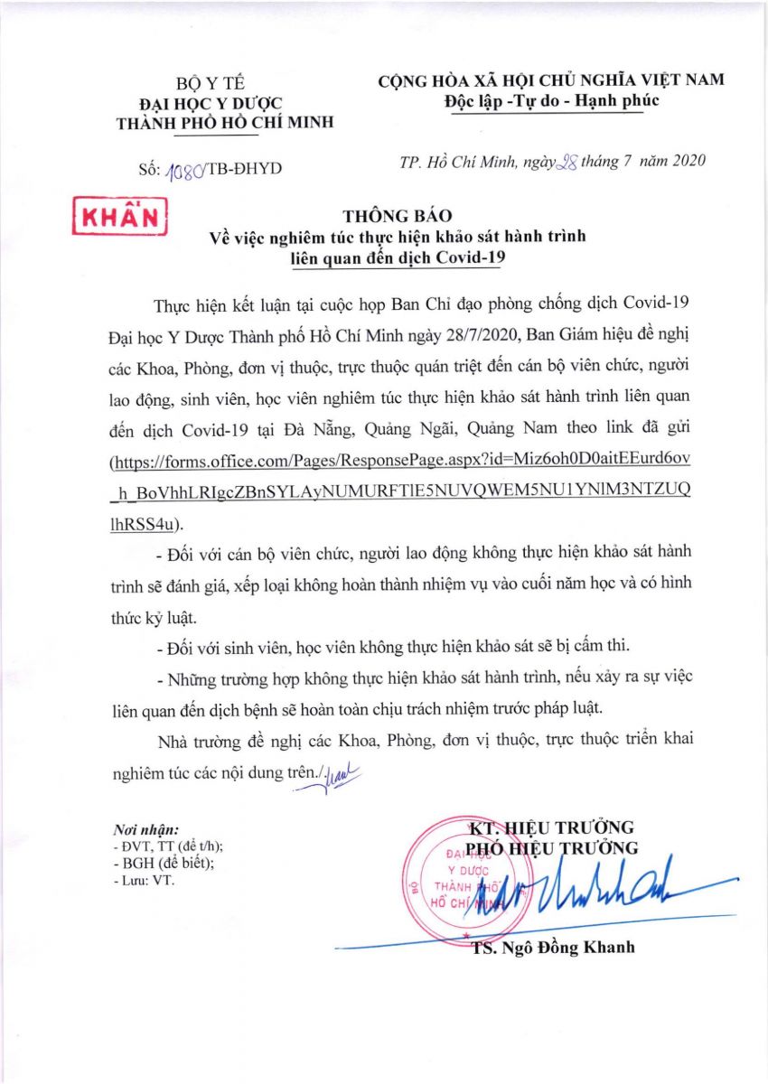 Thực hiện kết luận tại cuộc họp Ban Chỉ đạo phòng chống Covid-19 vx88 esball TP.HCM ngày 28/7/2020, Ban Giám hiệu đề nghị toàn thể sinh viên, học viên, cán bộ, viên chức, người lao động nghiêm túc thực hiện khảo sát hành trình liên quan đến dịch Covid-19 tại Đà Nẵng, Quảng Ngãi, Quảng Nam tại link: