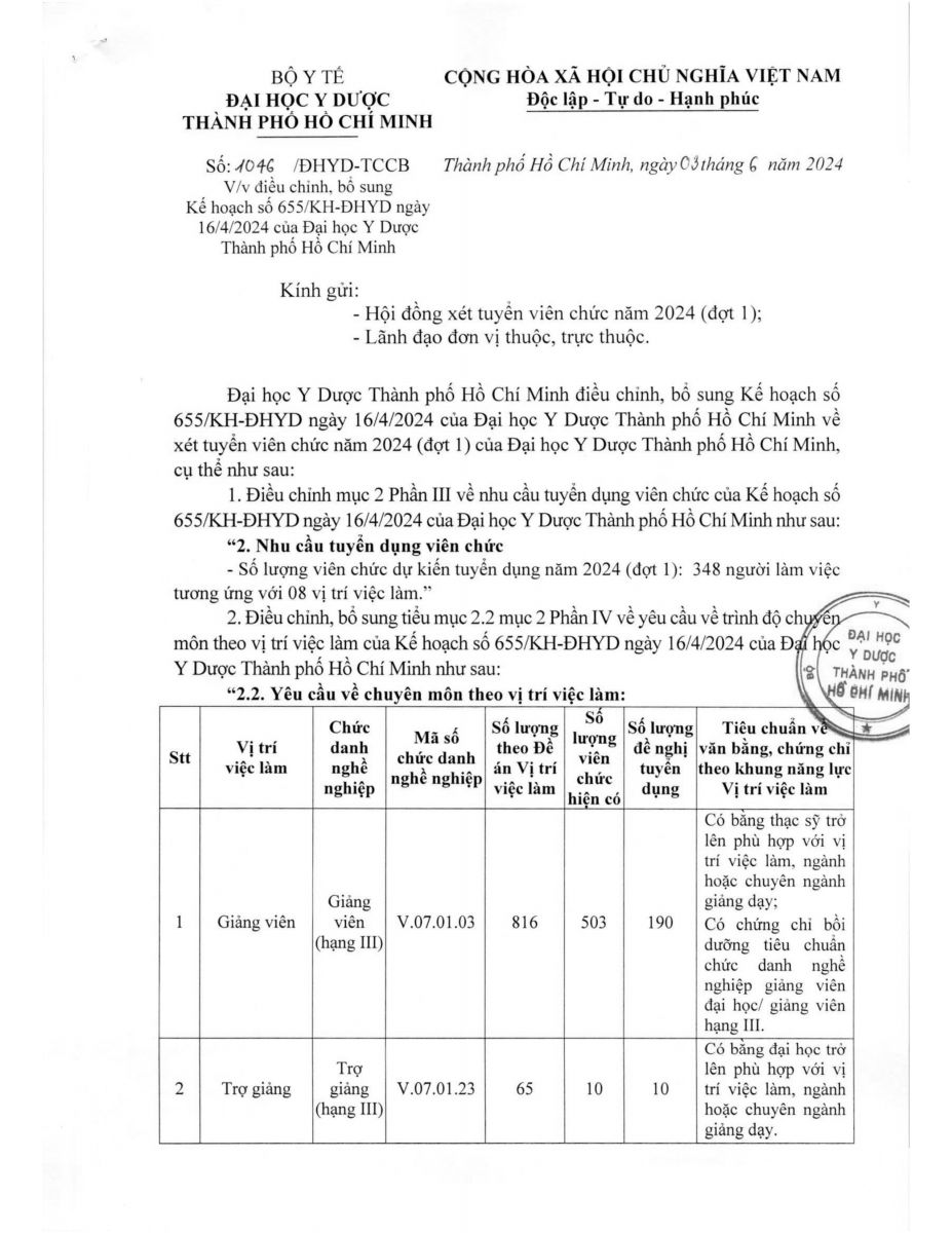 V/v điều chỉnh, bổ sung Kế hoạch số 655/KH-ĐHYD ngày 16/4/2024 của vx88 esball vx88b