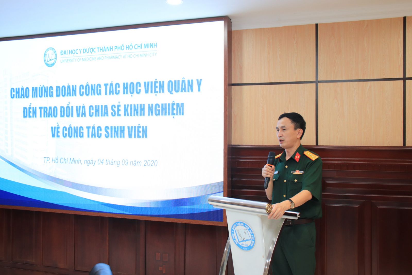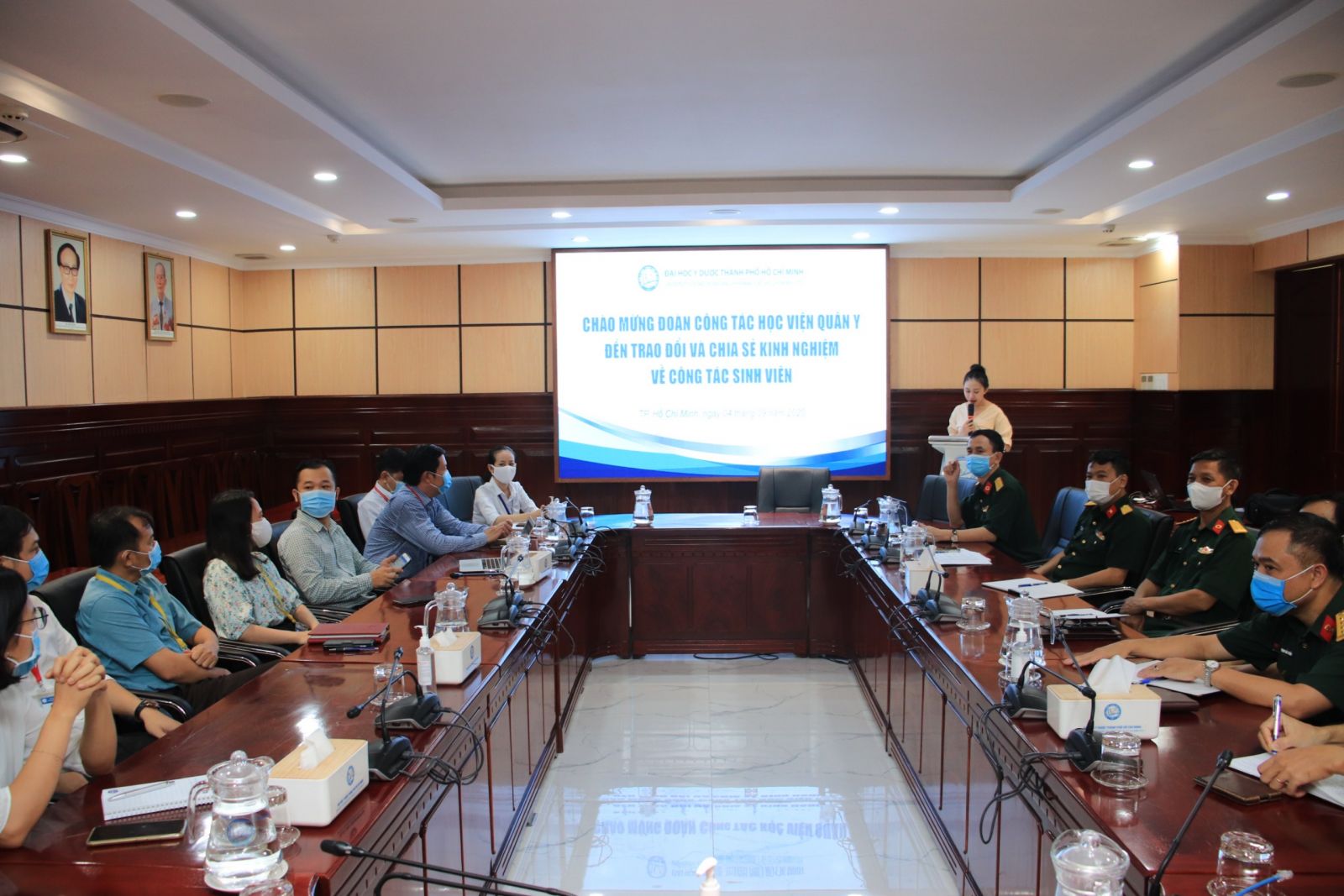 Mở đầu chương trình, PGS.TS. Nguyễn Ngọc Khôi đã bày tỏ niềm hân hoan của nhà trường khi được đón tiếp các thầy cô đến từ Học viện Quân Y để cùng nhau chia sẻ những kinh nghiệm bổ ích. Sau phần giới thiệu tổng quan về vx88 esball TP.Hồ Chí Minh, là đơn vị phụ trách trực tiếp về công tác quản lý sinh viên, ThS. Trương Văn Đạt – Trưởng Phòng Công tác sinh viên, Bí thư Đoàn trường đã trực tiếp trình bày, chia sẻ những kinh nghiệm cách thức quản lý, các hoạt động bổ ích thiết thực cho sinh viên trường và những chế độ, chính sách mà nhà trường đang triển khai đối với toàn thể sinh viên vx88 esball TP. Hồ Chí Minh.