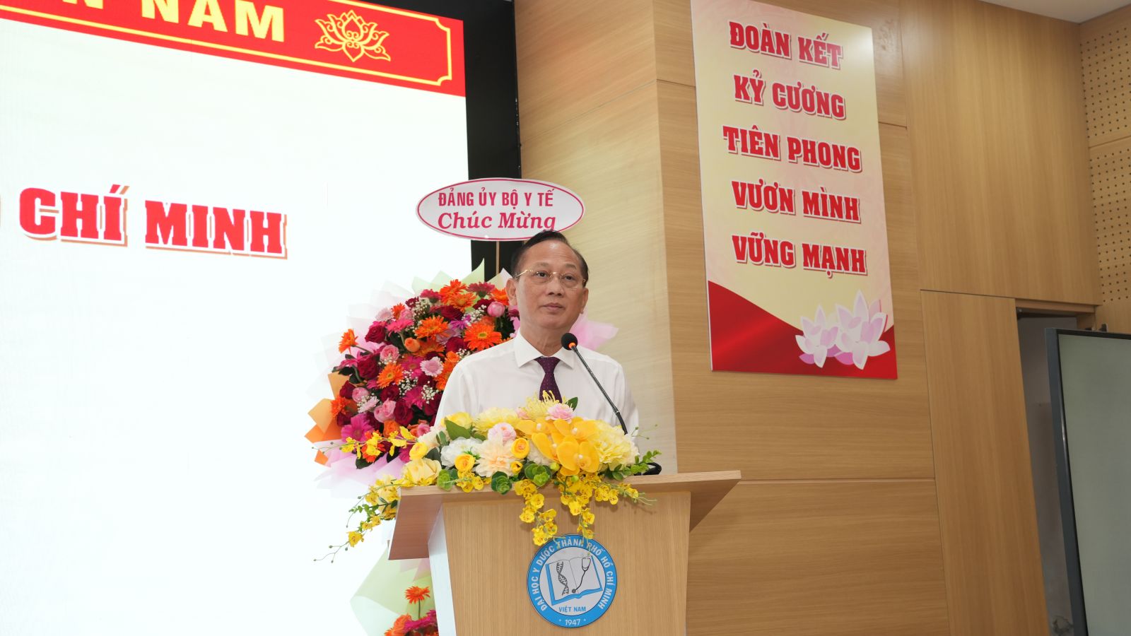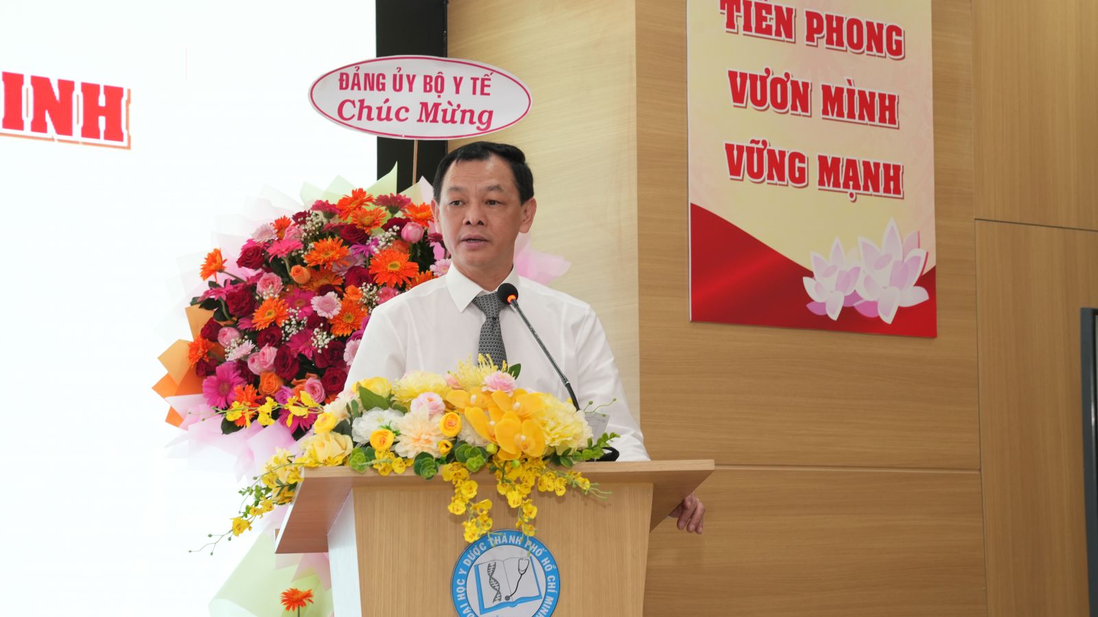 Phát biểu khai mạc, đồng chí Trần Diệp Tuấn – Bí thư Đảng ủy, Chủ tịch Hội đồng Trường – nhấn mạnh: Đại hội lần này là sự kiện chính trị quan trọng, đánh dấu bước chuyển mình mạnh mẽ trong chiến lược phát triển của Nhà trường, thể hiện rõ quyết tâm chính trị của toàn Đảng bộ trong việc khẳng định vai trò tiên phong trong lĩnh vực giáo dục – y tế trước vận hội mới của đất nước.