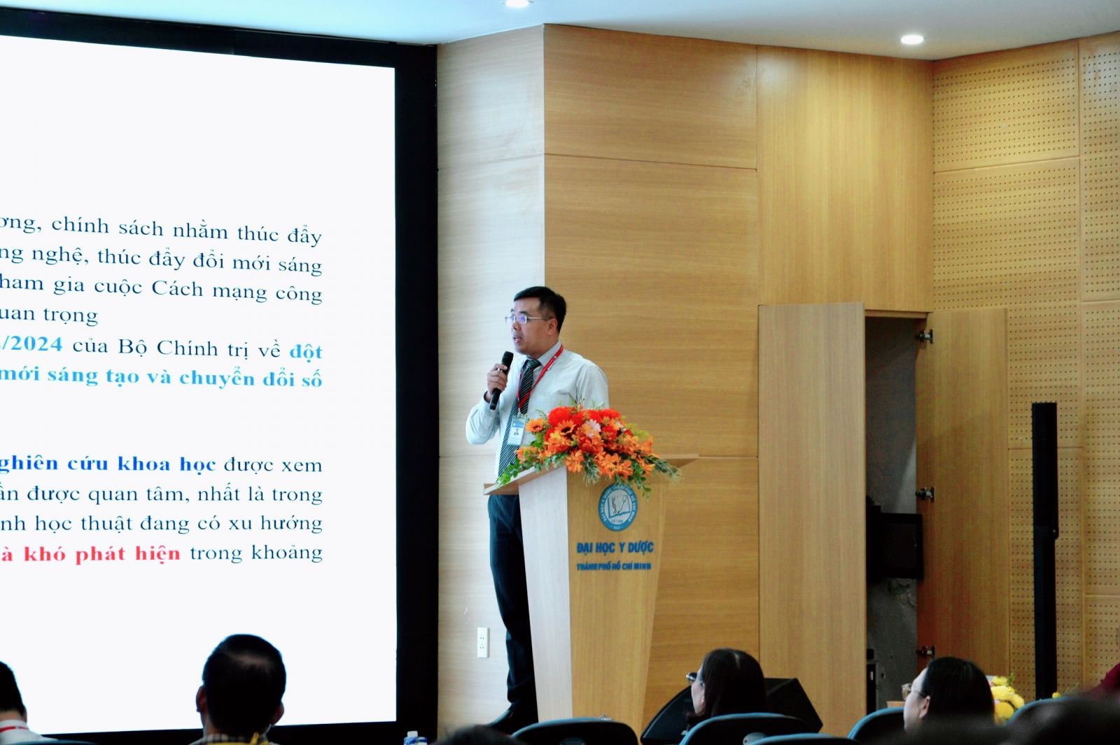 Tiếp nối chương trình, TS.BS Nguyễn Lê Việt Hùng – Trưởng phòng Thanh tra – Pháp chế đã giới thiệu Quyết định số 3334/QĐ-ĐHYD ngày 16/7/2025 của vx88 esball Thành phố Hồ Chí Minh về việc ban hành Quy định liêm chính học thuật của Nhà trường. Theo đó, TS.BS Nguyễn Lê Việt Hùng nhấn mạnh vx88 esball Thành phố Hồ Chí Minh luôn xác định nghiên cứu khoa học là một trong những nhiệm vụ trọng tâm và hoạt động chủ yếu của Nhà trường. Đảng ủy, Hội đồng Trường và Ban Giám hiệu đặc biệt quan tâm, chỉ đạo nhằm xây dựng môi trường học thuật trung thực, minh bạch, chuẩn mực và có trách nhiệm trong toàn Trường.