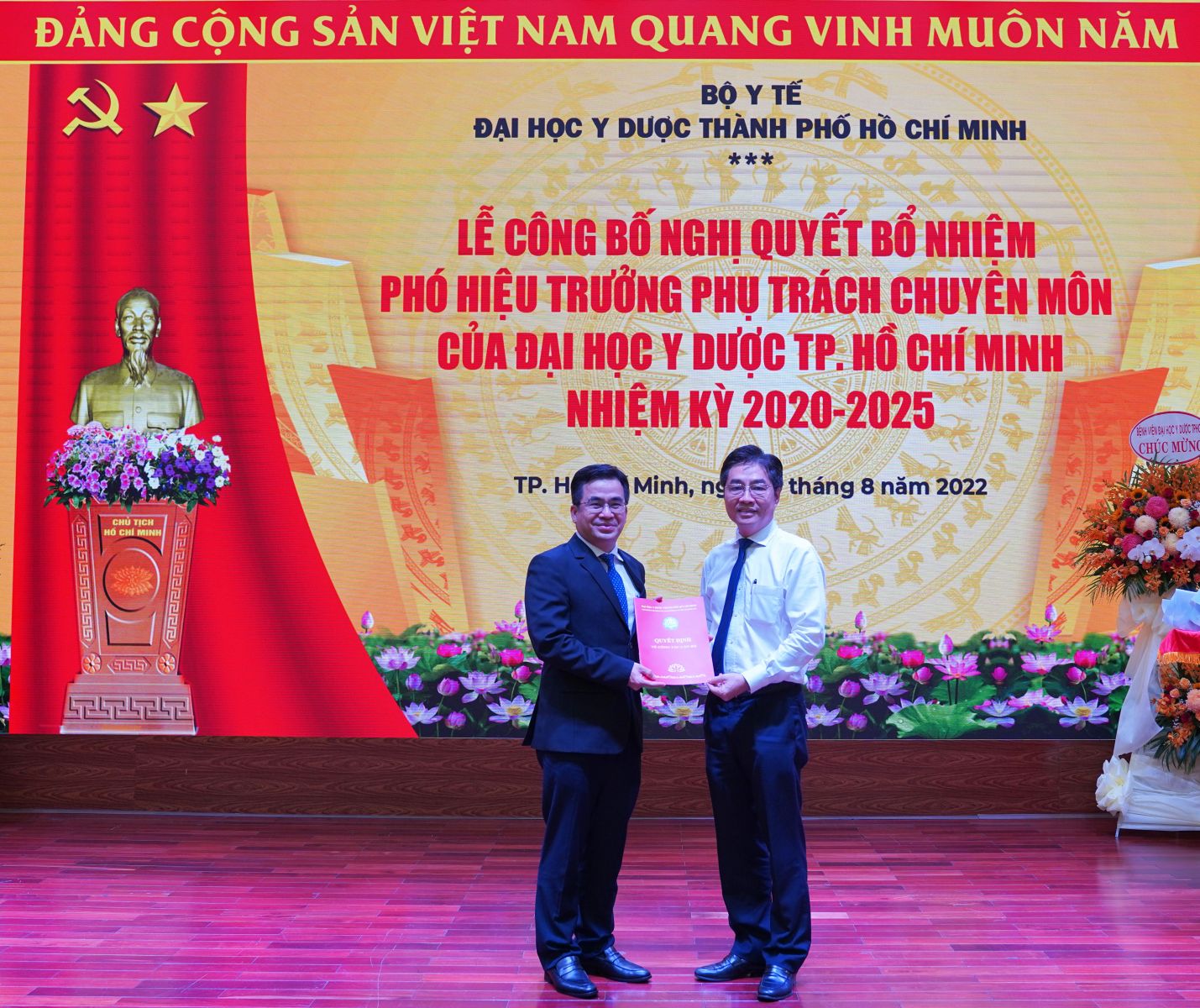 GS.TS. Trần Diệp Tuấn – Bí thư Đảng ủy, Chủ tịch vx88m đã trao Nghị quyết bổ nhiệm Phó Hiệu trưởng Phụ trách chuyên môn và PGS.TS. Nguyễn Trường Sơn – Ủy viên Ban Cán sự Đảng, Thứ trưởng Bộ Y tế tặng hoa chúc mừng đối với PGS.TS Ngô Quốc Đạt.