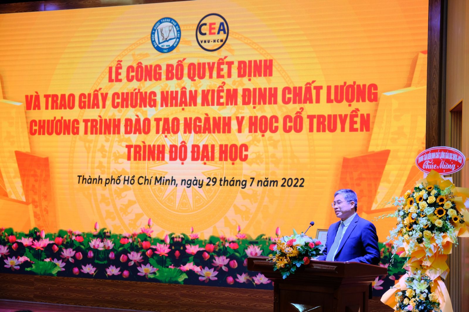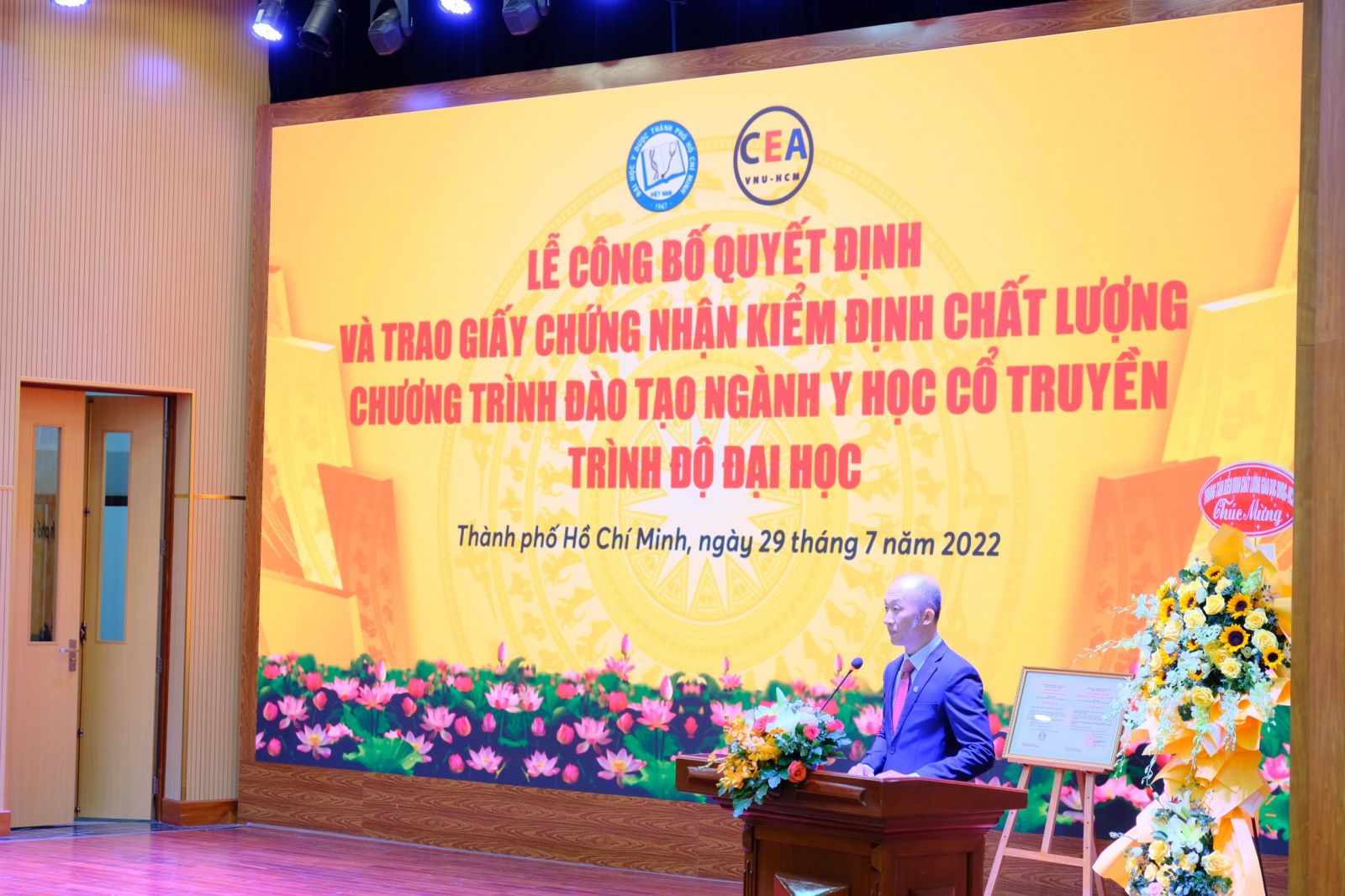 Phát biểu tại buổi lễ, PGS.TS. Nguyễn Hoàng Bắc - Phó Hiệu trưởng phụ trách đã chúc mừng tập thể Khoa Y học cổ truyền đã hoàn thành xuất sắc nhiệm vụ kiểm định chất lượng chương trình đào tạo phù hợp với Sứ mạng – Tầm nhìn – Giá trị cốt lõi cũng như chiến lược phát triển hệ thống ĐBCLGD của Nhà trường. Trong định hướng phát triển của Nhà trường giai đoạn 2020 -2025, Trường đưa ra 04 vấn đề: Đào tạo; Nghiên cứu khoa học; Quản trị đại học và Phục vụ cộng đồng. Đối với nhà trường vấn đề giáo dục rất quan trọng, từ năm 2020 nhà trường tự chủ chi thường xuyên và hướng tới tự chủ toàn phần. Nhà trường rất tự hào với vx88b đạt được của chương trình đào tạo ngành YHCT và mong tập thể Khoa YHCT tiếp tục phấn đấu cải tiến những điều còn chưa làm được để hoàn thiện hơn nữa về đào tạo, về quản trị đại học. Kết quả đánh giá của Khoa Y học cổ truyền cũng là nguồn động lực cho các khoa còn lại trong trường đang trong giai đoạn chuẩn bị và đăng ký kiểm định.