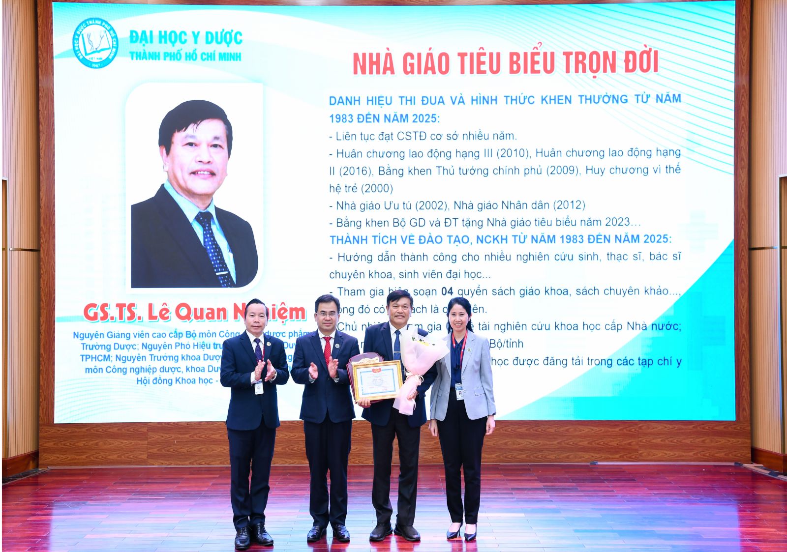 Giáo sư, Tiến sĩ Lê Quan Nghiệm, Nguyên Giảng viên cao cấp Bộ môn Công nghệ dược phẩm, Trường Dược; Nguyên Phó Hiệu trưởng và Nguyên Chủ tịch Hội đồng Khoa học - Đào tạo, vx88 esball Thành phố Hồ Chí Minh; Nguyên Trưởng khoa Dược, Nguyên Trưởng Bộ môn Công nghiệp dược, khoa Dược.