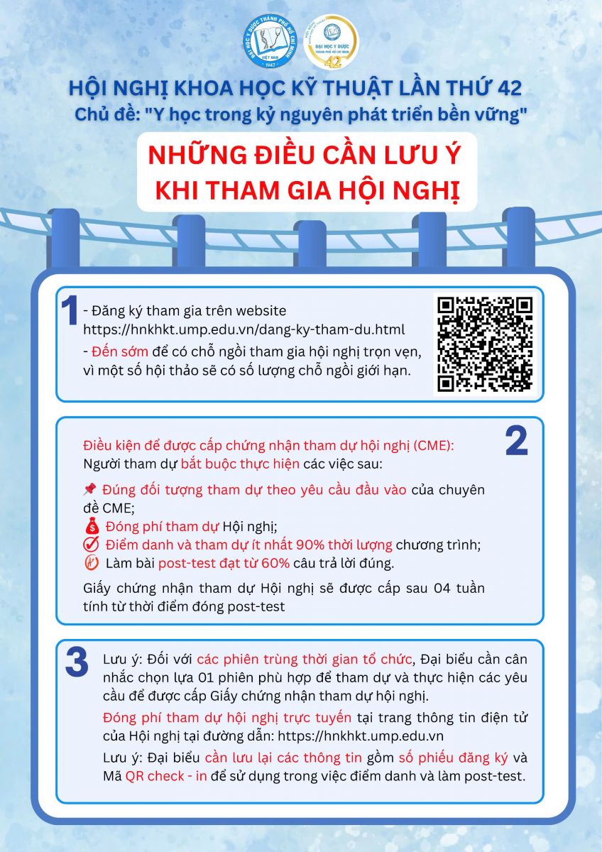 Hội nghị Khoa học Kỹ thuật lần thứ 42 của vx88 esball TP.HCM với chủ đề “Y học trong kỷ nguyên phát triển bền vững” sẽ diễn ra trong thời gian tới. Để việc tham dự hội nghị được thuận lợi, Ban Tổ chức lưu ý một số thông tin quan trọng dành cho đại biểu: