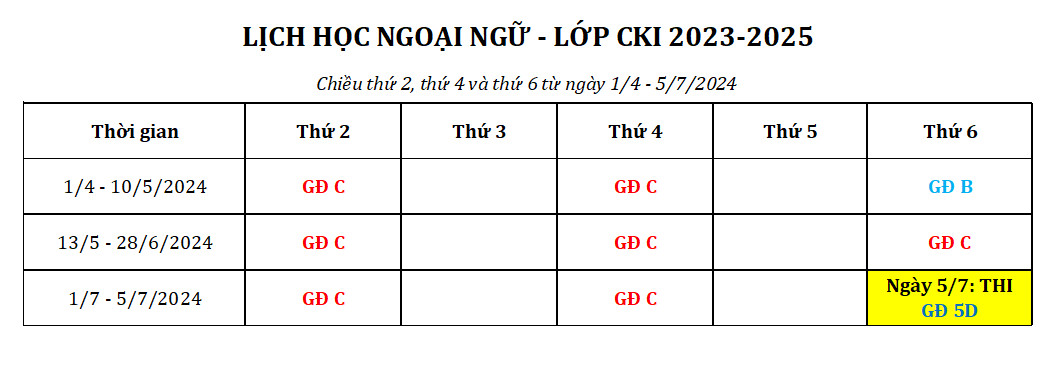 - Thời gian học: Chiều hai, tư và sáu hàng tuần, từ 01/04/2024 đến 03/07/2024.