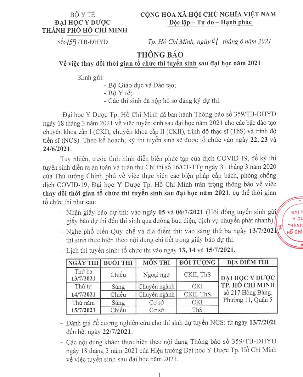 vx88 esball Thành phố Hồ Chí Minh đã ban hành Thông báo số 359/TB-ĐHYD ngày 18 tháng 3 năm 2021 về việc tuyển sinh sau đại học năm 2021 cho các bậc đào tạo chuyên khoa cấp I, chuyên khoa cấp II, trình độ thạc sĩ và trình độ vx88m. Theo kế hoạch, kỳ thi tuyển sinh được tổ chức vào ngày 22, 23 và 24 tháng 6 năm 2021.